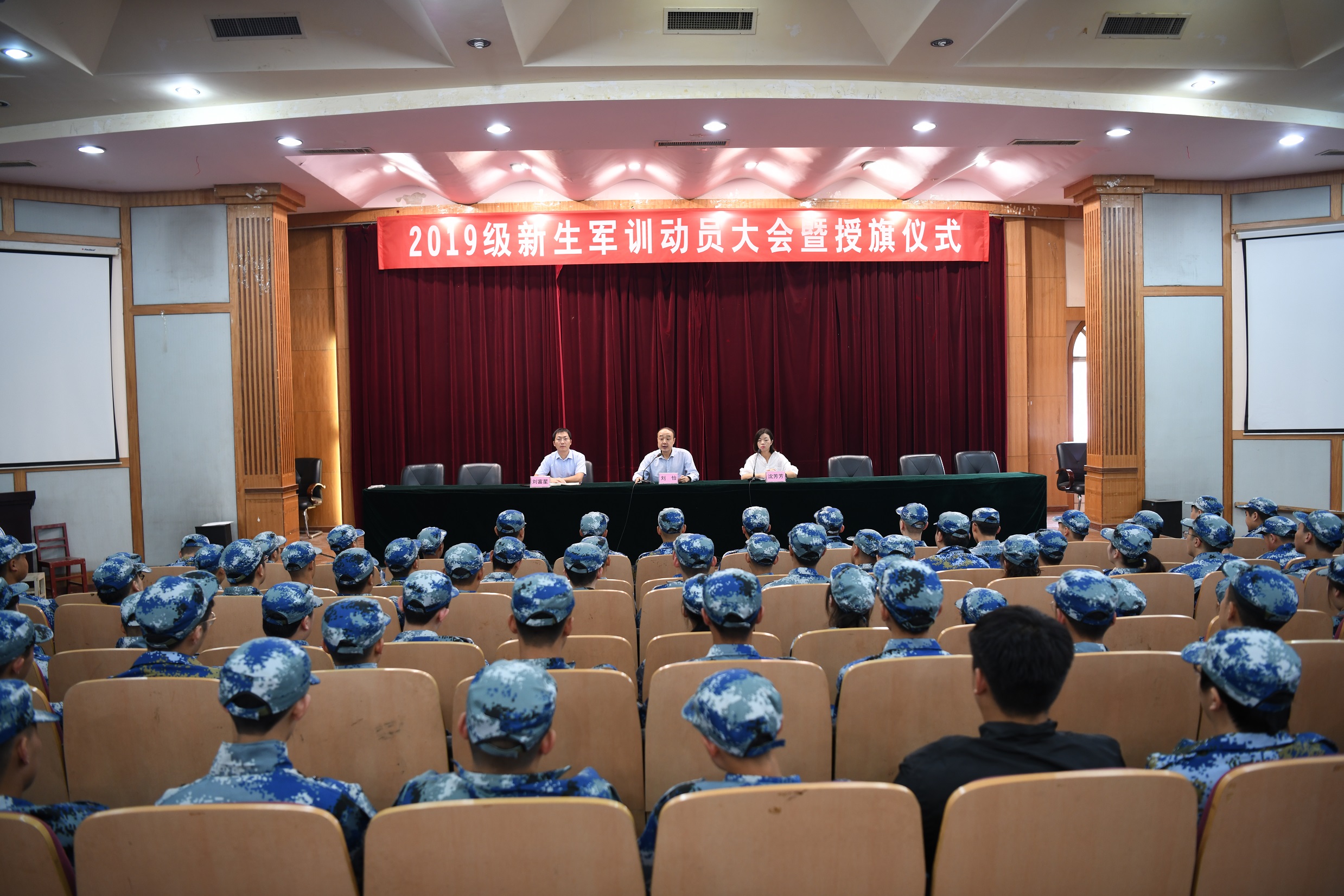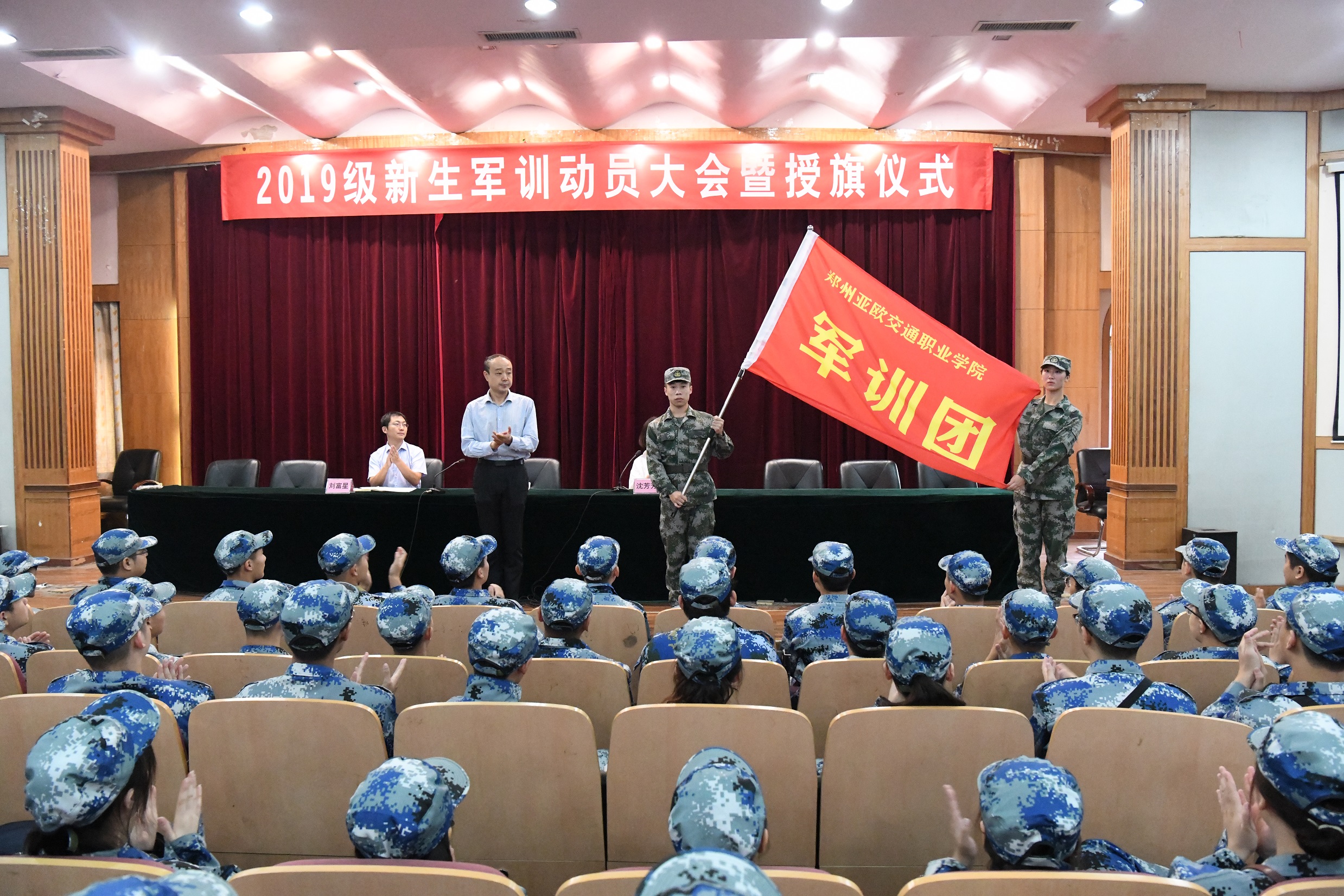 9月16日,开云在线登录app入口2019级新生军训动员暨授旗仪式在第一报告厅隆重举行。学院筹建办公室主任刘怡、副主任刘富星、辅导员沈芳芳出席动员会。
