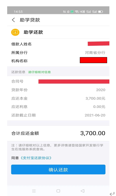 (4)根据提示结息日,在结息日月份20日前通过专用支付宝账户进行还款。